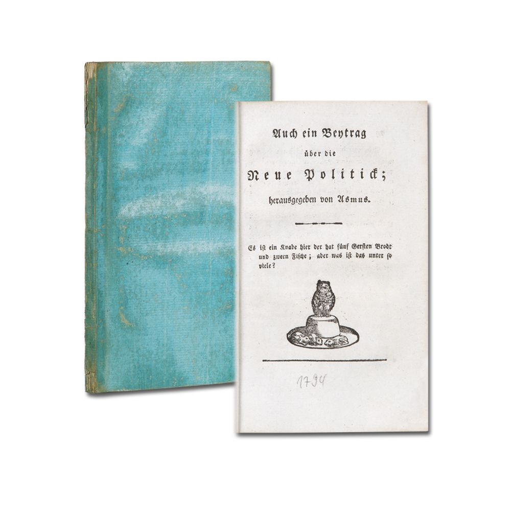 [CLAUDIUS, M.]: Auch ein Beytrag über die Neue Politick; herausgegeben von Asmus. [Hamburg 1794] 1Bl., 74 S., Holzschnitt-Titelvignette. Sehr sauberes Exemplar. Lackpapierumschlag der Zeit.
