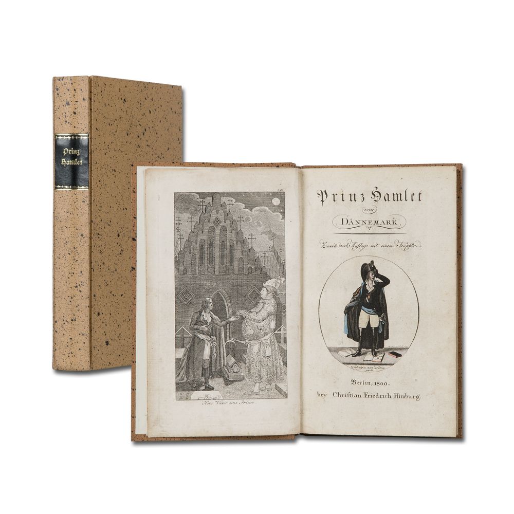 [SCHINK, J. F.]: Prinz Hamlet von Dännemark. 2. verb. Auflage mit einem Kupfer Berlin Chr. Fr. Himburg 1800 Gestochenes Frontizpiz, gestochener Titel mit kolorierter Vignette von Chodowiecki, 206 S. Pappband im Stil der Zeit.