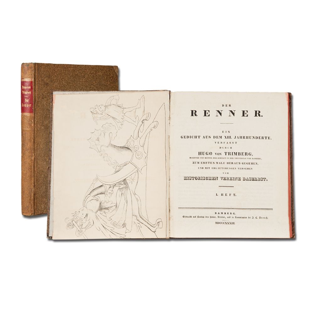 HUGO von TRIMBERG: Der Renner. Ein Gedicht aus dem XIII. Jahrhundert, zum ersten Male heraus gegeben, und mit Erläuterungen versehen vom historischen Vereine Bamberg. 3 Hefte in 1 Band Bamberg J. C. Dresch 1833-34 Quart. Lithographiertes Frontispiz, 11 BI., 274 S., 1 gefaltete lithographierte Tafel. Pappband der Zeit.