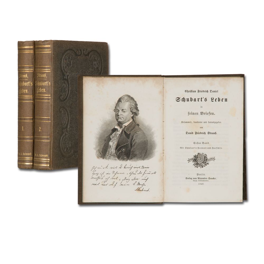 STRAUSS, D. F.: Christian Friedrich Daniel Schubart's Leben in seinen Briefen. Gesammelt, bearbeitet und herausgegeben v. David Friedrich Strauß. 2 Bde. Berlin A. Duncker 1849 Frontispiz mit Portrait und faksimiliertem Autograph Schubarts in Stahlstich, XII, 2 Bl., 448 S.; 2 Bl., 469, (3) S. Ppbde. der Zeit mit goldgepr. Rückentitel.