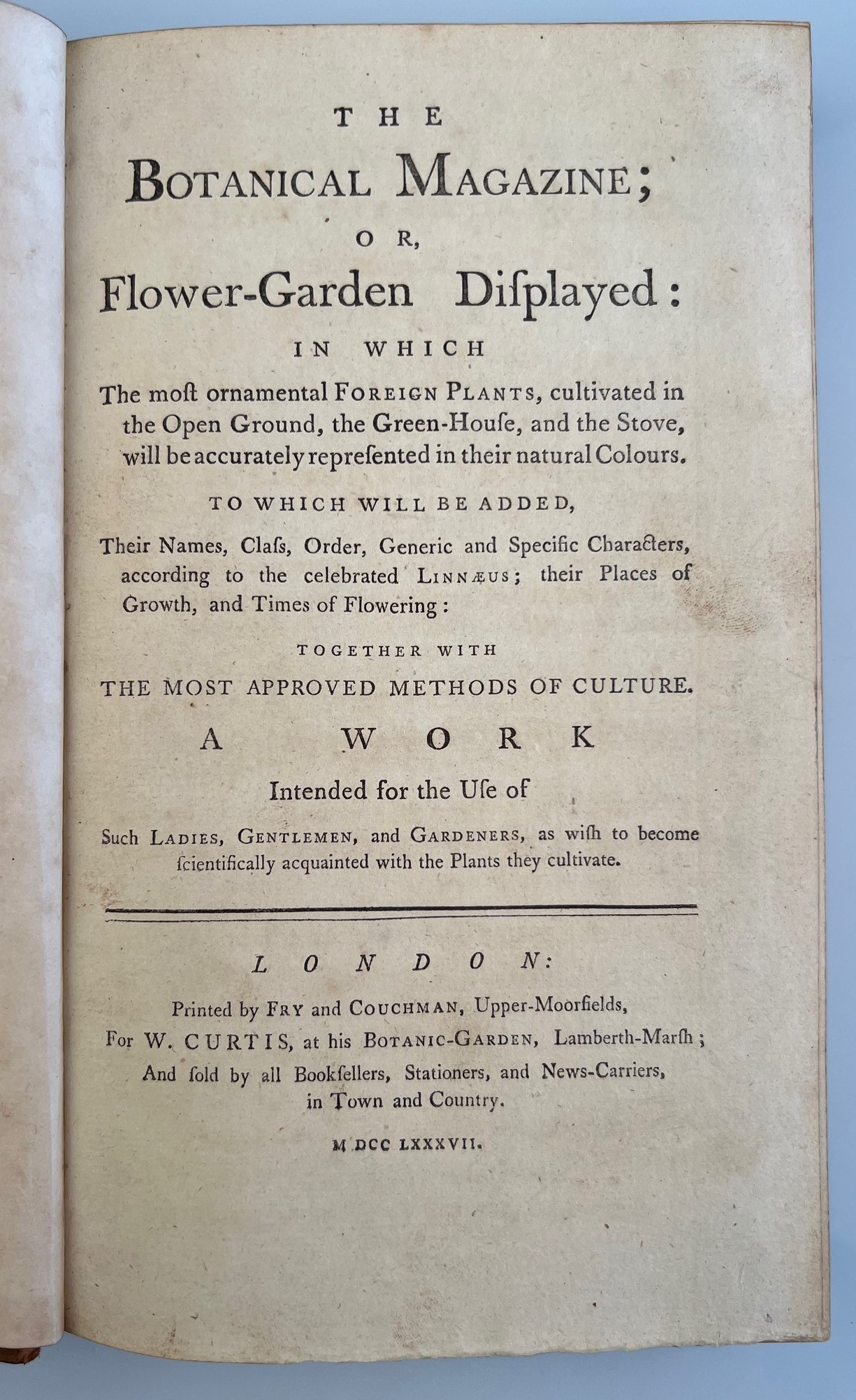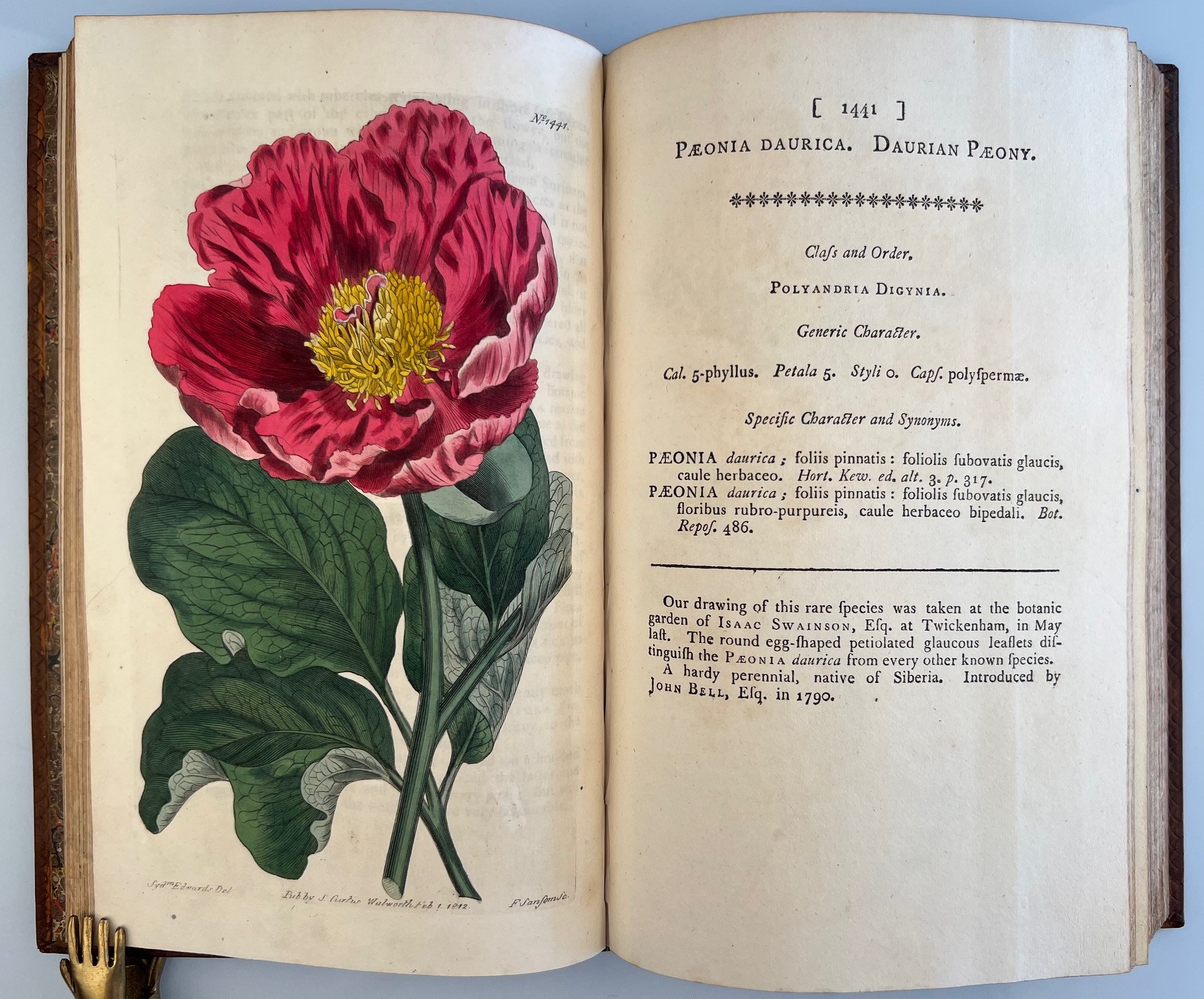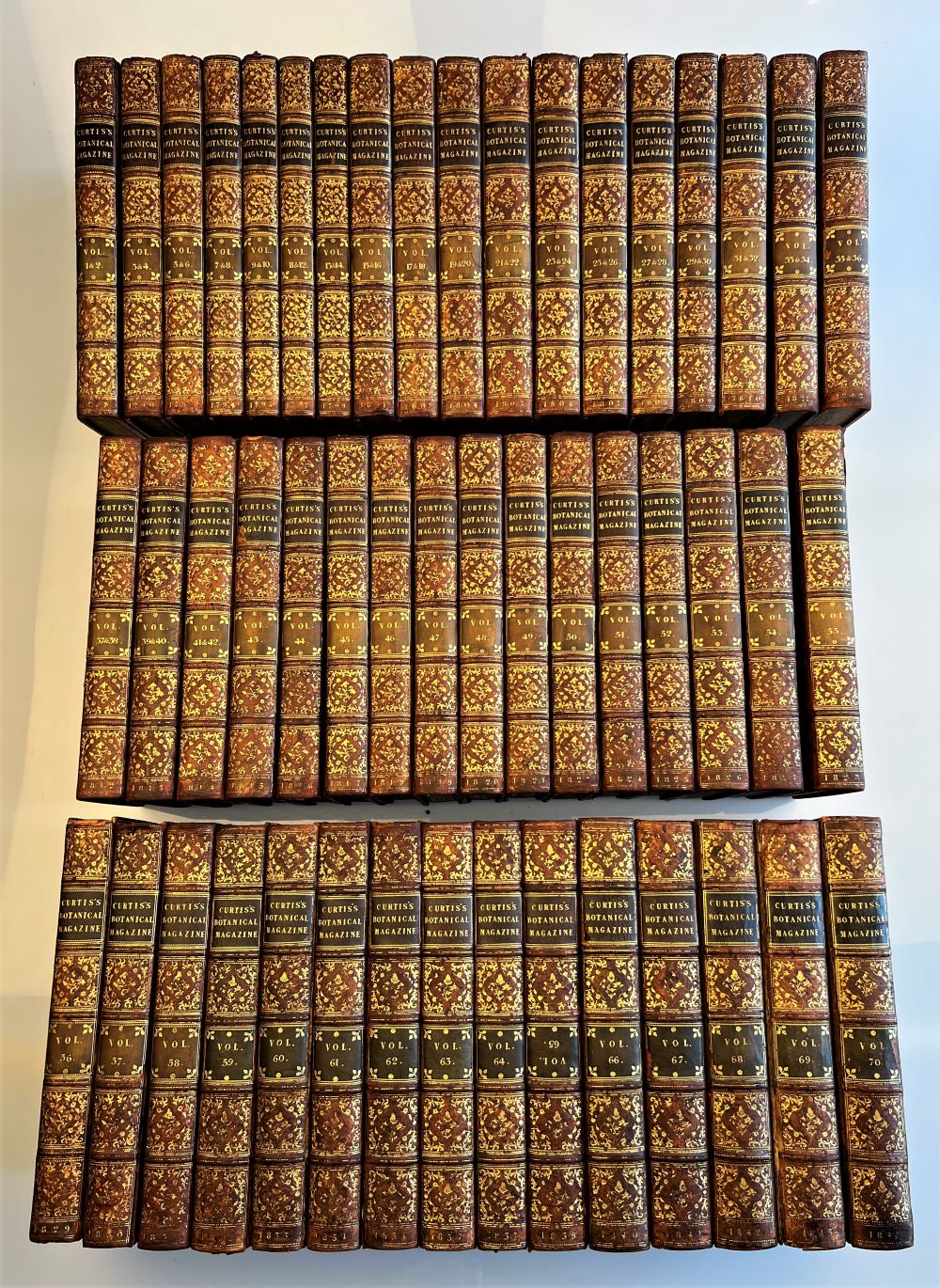 CURTIS, W.: The botanical Magazine, or Flower Garden Displayed. Vol. 1-70, bound in 49. London, S. Couchman. 1787-1844 Octavo 23,5 x 14 cm. With 4138 fine hand-coloured engravings, some folded. Plates 120, 903B, 1605 uncolored, as normal. 3 never bound in missing plates 361-363 in vol XI, plates 553-1075 with entry of the names of the plants with ink or pencil in old hand. From plate 3776 as usual somewhat browned, since from 1840 other paper was used for the plates. The white front and endpapers somewhat foxed, some vols partly with browned leaves as normal for this serial, the rest very clean and in excellent condition. Contemporary full tan calf, spine richly gilded, marbled sides fitted to the marbled endpapers. Overall condition very good with a little general wear, some vols with partly broken joints but without loss of stability. All volumes with bookplate on the front inside cover.