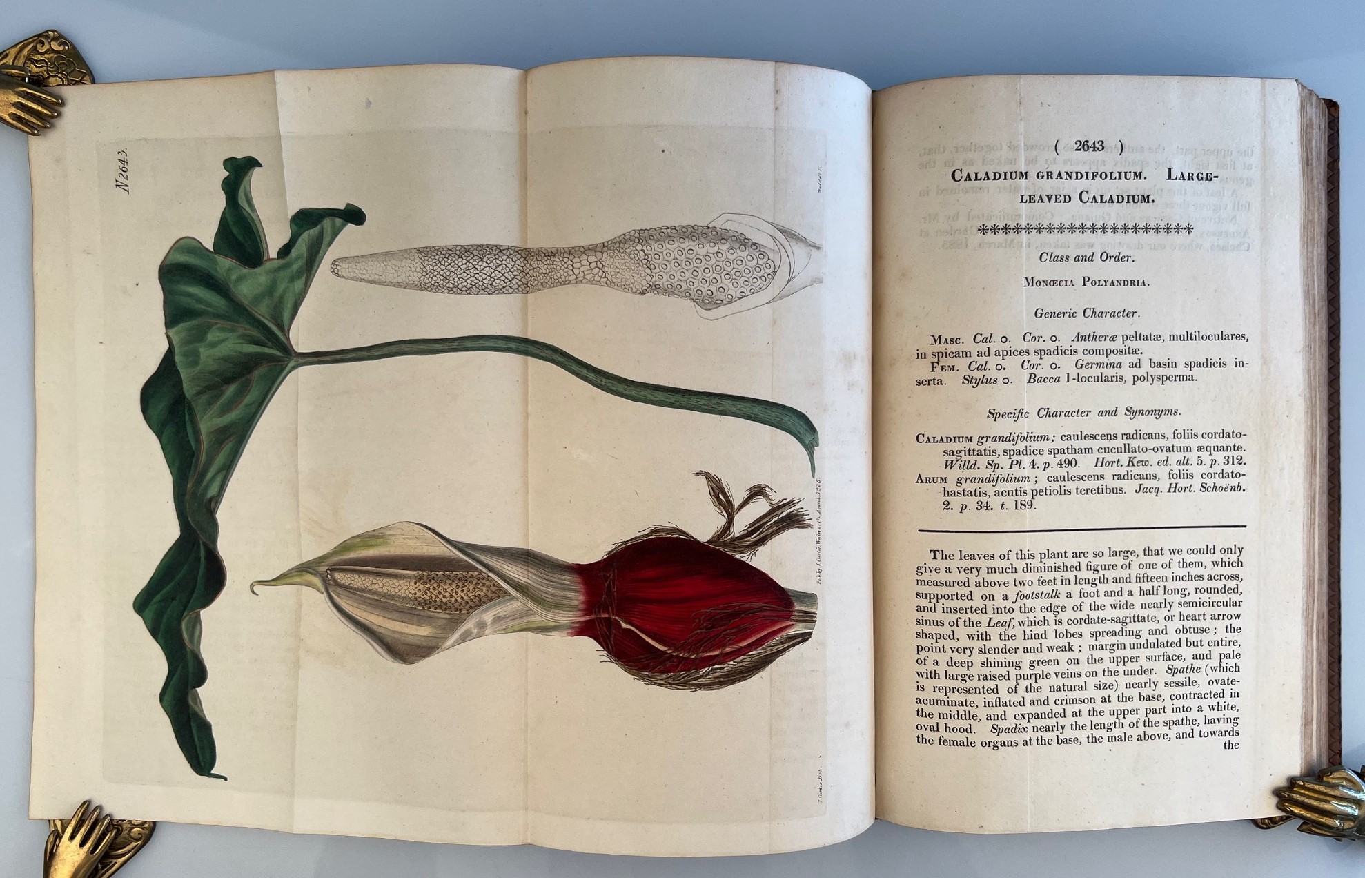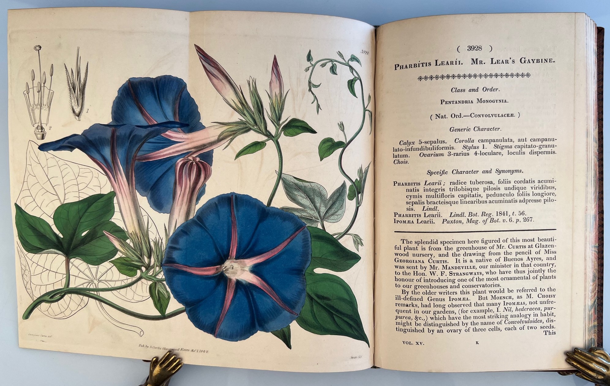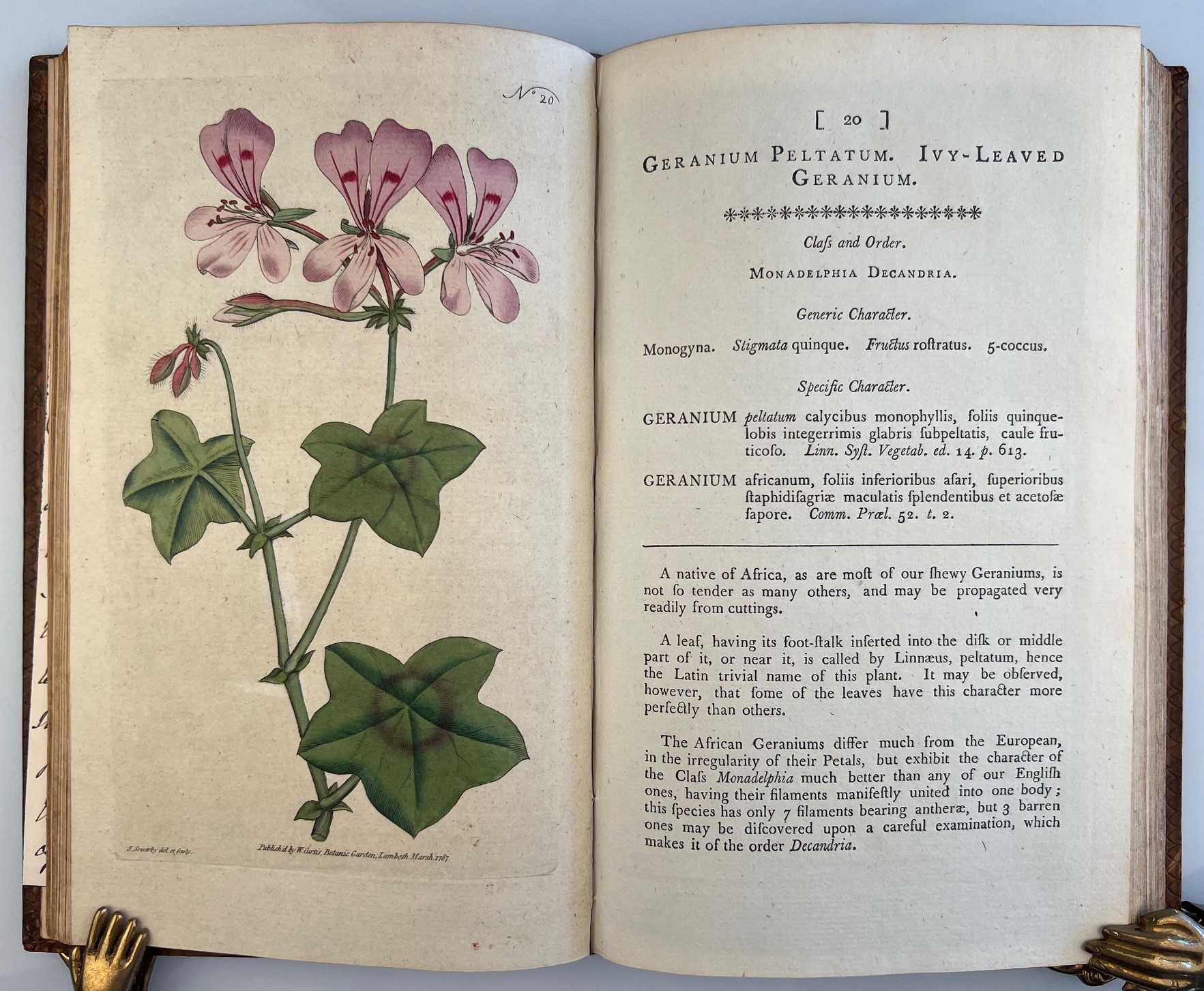 CURTIS, W.: The botanical Magazine, or Flower Garden Displayed. Vol. 1-70, bound in 49. London, S. Couchman. 1787-1844 Octavo 23,5 x 14 cm. With 4138 fine hand-coloured engravings, some folded. Plates 120, 903B, 1605 uncolored, as normal. 3 never bound in missing plates 361-363 in vol XI, plates 553-1075 with entry of the names of the plants with ink or pencil in old hand. From plate 3776 as usual somewhat browned, since from 1840 other paper was used for the plates. The white front and endpapers somewhat foxed, some vols partly with browned leaves as normal for this serial, the rest very clean and in excellent condition. Contemporary full tan calf, spine richly gilded, marbled sides fitted to the marbled endpapers. Overall condition very good with a little general wear, some vols with partly broken joints but without loss of stability. All volumes with bookplate on the front inside cover.