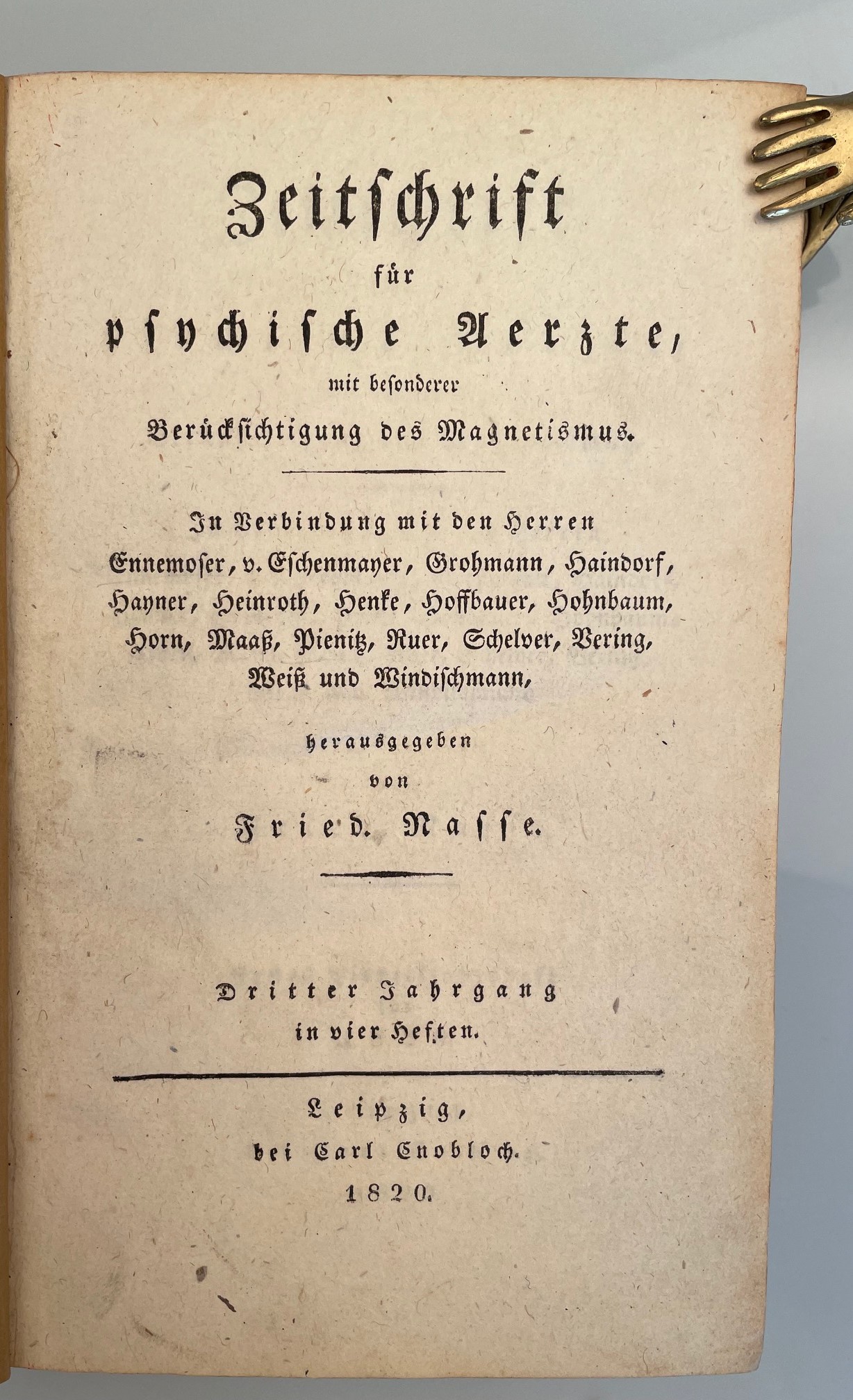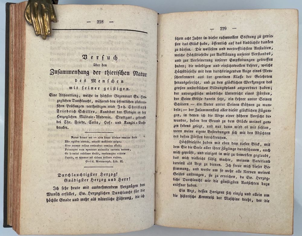 SCHILLER, F.: Versuch über den Zusammenhang der thierischen Natur des Menschen mit seiner geistigen. Eine Abhandlung ... [In]: Zeitschrift für psychische Aerzte mit besonderer Berücksichtigung des Magnetismus. Jg. 3, Heft 2. Leipzig, C. Cnobloch 1820. S. 228-283. [Vorgebunden]: Romberg, M.: F. Schiller's akademische Streitschrift über den Zusammenhang der thierischen Natur des Menschen mit seiner geistigen. S. 225-227. Insgesamt 888 S. Pappband.