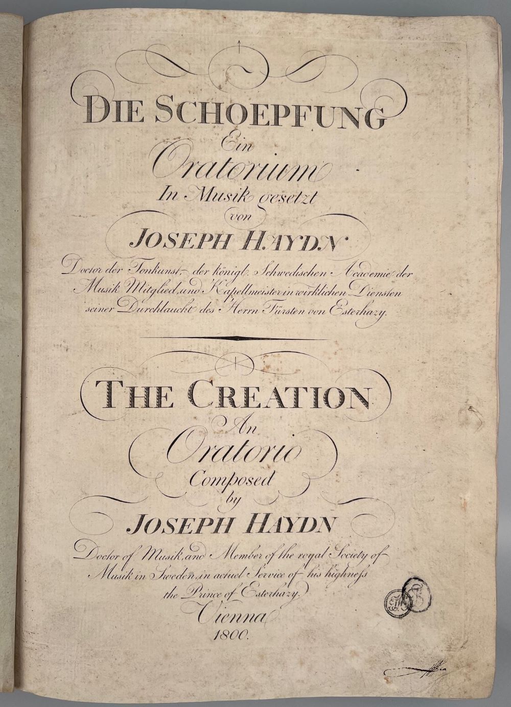 A GREAT MILESTONE OF ORATORIO LITERATURE EXCEPTIONAL AND EXTREMELY RARE CIMELIA: WITH AUTOGRAPH AUTHORIZATION OF HAYDN Very rare engraved first edition of the full-score in very good condition of Haydn's most important vocal work, still published by himself: Most copies, but not all are bearing his monogram stamp in the lower right corner of the title page, which was used by his printer to mark editions authorized by Haydn. What makes this copy special, however, there are two monogram stamps, the second at the right probably applied by Haydn himself, and below in addition his autograph authorization "MPria" (Manu Propria) written in ink. It was a habit of Haydn's to add the note "Manu Propria" at the end of his autograph signature. Hoboken does mention that there are copies with Haydn's signature, but not how many and what these signatures look like. As far as we were able to track copies in trade and libraries, there are a very few with the autograph authorization of Haydn, for example the copy in the "Österreichische Nationalbibliothek", but which has no monogram stamps. Therefore, in comparison to other copies, our copy seems to be unique! The list of subscribers, with 409 persons listed who ordered 507 copies, reflects Haydn's fame throughout Europe and reads like a "Who's Who," starting with the Austrian Empress, the Queen of England, and many other royal highnesses from Italy, Hungary, German lands, et al. Duchess Amalia of Saxony-Weimar and Franziska of Württemberg, among others, but also well-known personalities of European musical life, such as Burney, Cannabich, Clementi, who ordered 24 copies at once, Fux, Simrock etc. Haydn published the work himself, among other things because he believed that he could earn more money this way than if he had given it to a publisher. His public statement reveals another motivation: "The acclaim that my oratorio: "Die Schöpfung" had the good fortune to receive and the wish expressed in ... the "Musikalische Zeitung" that its publication should not... be left to foreigners, have induced me to organize it myself. The work shall therefore appear, nicely and correctly engraved, printed on good paper, provided with English text in addition to the German, in three or at the most four months...". (J. Hayden on 15.6.1799 in the Intelligenzblatt Nr: XV of the AMZ). Haydn was also motivated to self-publish by the incredible performance success of his oratorio, which was first performed privately at the Schwarzenberg Palace on April 29 and 30, 1798, and in publicity with a larger cast on March 19, 1799, and quickly became incredibly successful with many more performances throughout Europe. "The Creation brought in the biggest box-office returns in the history of Vienna; it conquered, in one fell swoop .... a Europe divided by war; it reunited all classes - Catholic Austria, Anglican England, Evangelical Berlin and even laicized Paris - in admiration, and repeatedly moved thousands and thousands of listeners to tears of devotion and emotion." (Landon, Robbins: Haydn: The Years of the Creation, p.344). The publication of the score was delayed until the end of December 1799 and then again until June 1800, since, among other things, four copper plates broke during printing by Artari in Vienna in April 1800. Breitkopf & Härtel had hoped to receive the commission for the first edition, but nevertheless "supported Haydn's self-publishing by taking over the collection of subscribers and soon ordered a larger number of scores." (Hase, H.v.: Joseph Haydn und Breitkopf & Härtel, Lzg. 1909). Haydn returned the favor by giving the plates to Breitkopf & Härtel at the end of December 1801 after the first printing, where a title edition then appeared in 1803. (cf. Artaria, Franz: J. Haydn und das Verlagshaus Artaria, Vienna 1909, pp. 83 and 86). - Hoboken XXI, 2a, p.36; RISM H2521; BSB 7, 2673; Hirsch IV, 799. EIN GROSSER MEILENSTEIN DER OATORIENLITERATUR AUSSERGEWÖHNLICHE UND ÄUSSERST SELTENE ZIMELIEN: MIT AUTOGRAPHER AUTORISIERUNG VON HAYDN. Sehr seltene gestochene Erstausgabe der Partitur in sehr gutem Zustand von Haydns bedeutendstem Vokalwerk, noch von ihm selbst herausgegeben und mit seinem Monogrammstempel rechts unten im Titelblatt versehen, der von seinem Drucker verwendet wurde, um von Haydn autorisierte Ausgaben zu kennzeichnen. Besonders macht dieses Exemplar aber ein weiterer Monogrammstempel, wahrscheinlich von Haydn persönlich aufgebracht und darunter seine zusätzliche eigenhändige Authorisierung mit "MPria" (Manu Propria) in Tinte vermerkt. Es war eine Gewohnheit von Haydn, seine eigenhändigen Briefe am Ende mit dem Vermerk "Manu Propria" zu versehen. Hoboken erwähnt zwar, dass es Exemplare mit der Unterschrift Haydns gibt, aber nicht wie viele. Das Subskribentenverzeichnis mit 409 aufgeführten Personen, die 507 Exemplare bestellt haben, spiegelt die Berühmtheit von Haydn in ganz Europa wieder und liest sich wie ein "Who's Who", angefangen von der österreichischen Kaiserin, der Königin von England und vielen weiteren königlichen Hoheiten aus Italien, Ungarn, deutschen Länder, u.a. Herzogin Amalia von Sachsen-Weimar und Franziska von Württemberg aber auch bekannte Persönlichkeiten des europäischen Musiklebens, wie Burney, Cannabich, Clementi, der gleich 24 Exemplare bestellte, Fux, Simrock etc. Haydn veröffentlichte das Werk selbst, unter anderem, weil er glaubte, so mehr Geld zu verdienen als wenn er es einem Verleger übergeben hätte. Seine öffentliche Erklärung zeigt noch eine andere Motivation auf: "Der Beyfall, den mein Oratorium: die Schöpfung allhier zu erhalten das Glück hatte und der in ... der Musikalischen Zeitung geäußerte Wunsch, dass deren Bekanntmachung nicht ... den Ausländern überlassen seyn möge, haben mich bewogen, diese selbst zu veranstalten. Das Werk soll also, nett und richtig gestochen, auf gutem Papier abgedruckt, nebst dem Deutschen auch mit englischem Text versehen, in drey oder höchstens vier M