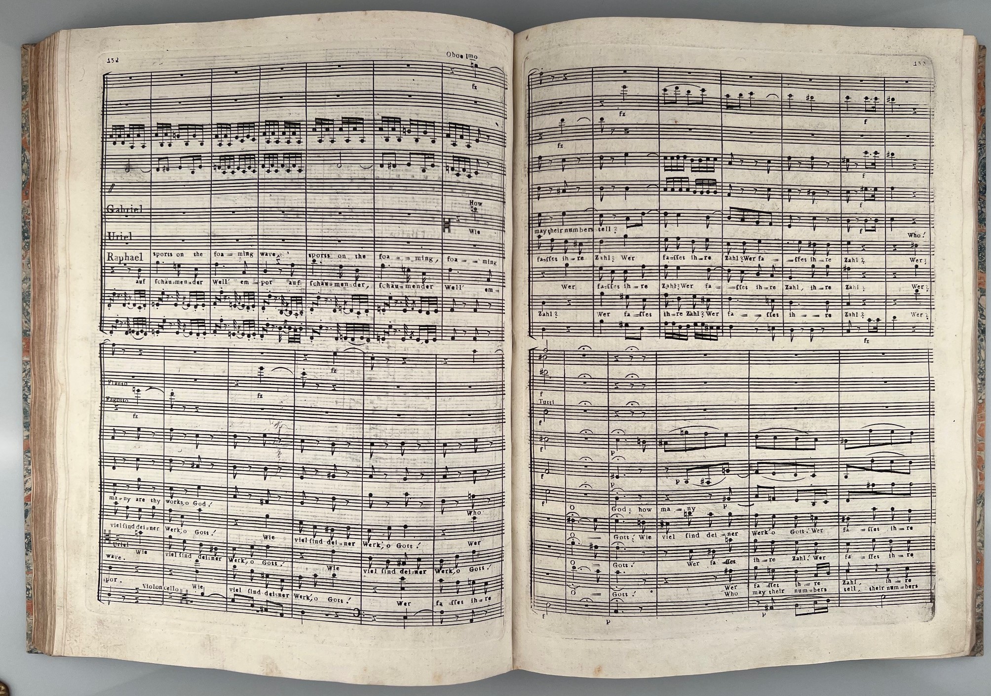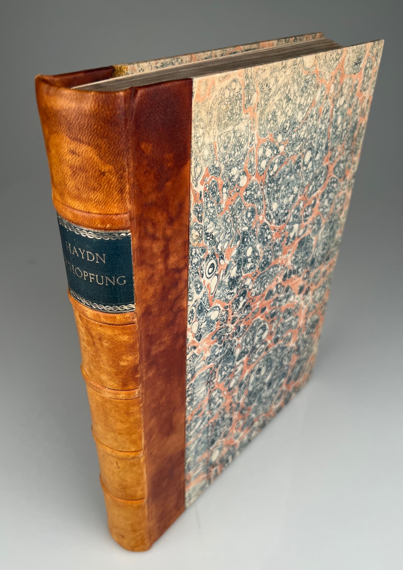 HAYDN, J.: Die Schöpfung. Ein Oratorium ... von Joseph Haydn Doctor der Tonkunst. ... The Creation An Oratorio ... Vienna 1800 Folio. Engraved title, 4 ff. list of subscribers, 303 pp. Very clean copy on stronger mould made paper. With addition of some bars of Trombone on page 192ff. in ink of old hand. Very nice half leather binding in the style of the time with contemporary marbled colored paper.