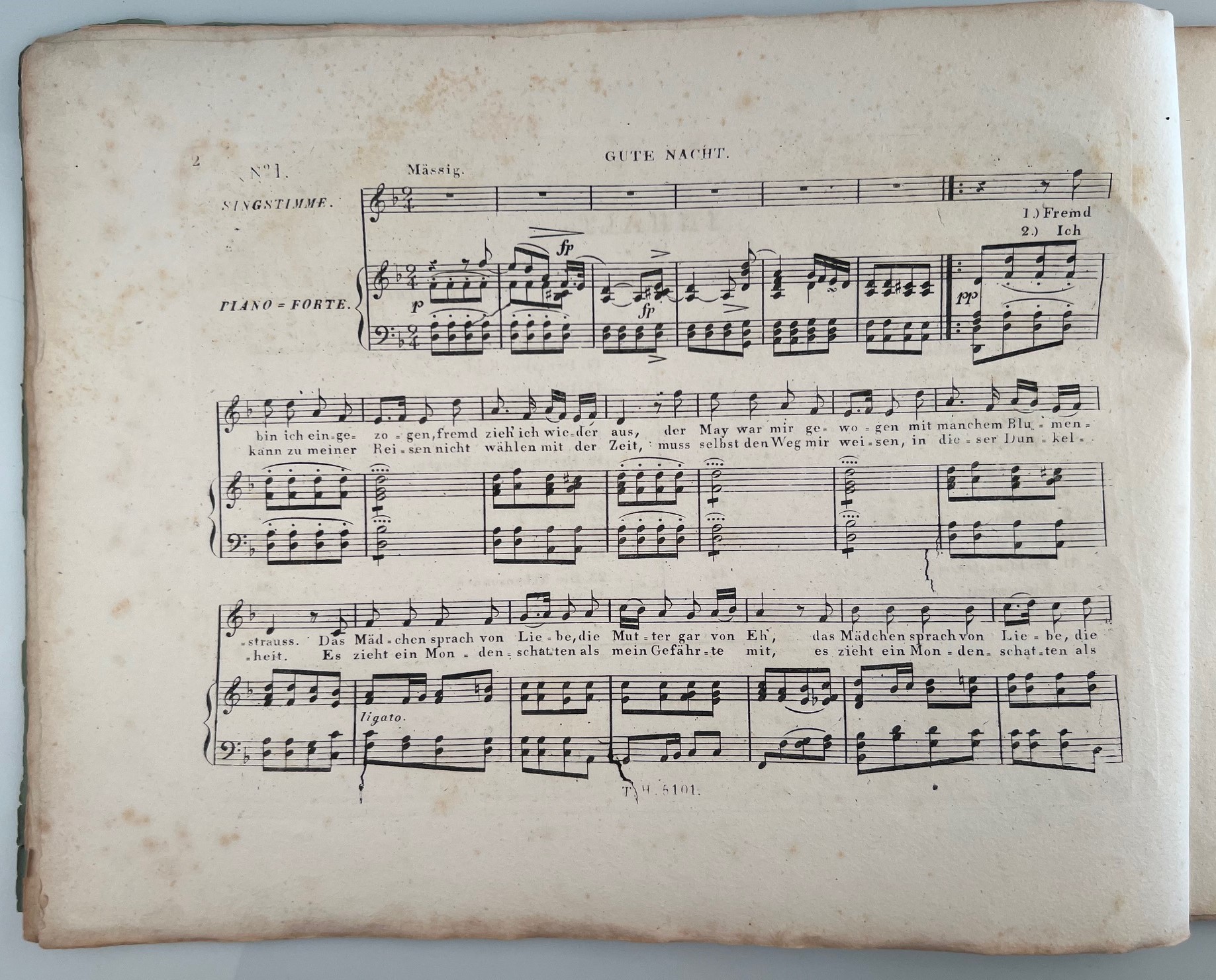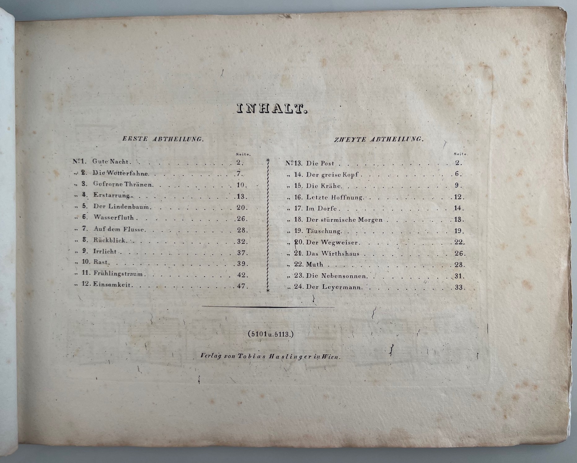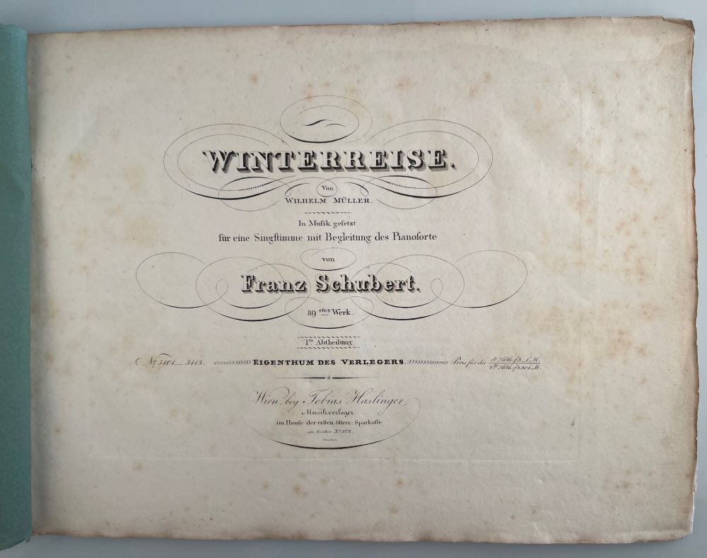 SCHUBERT, F.: Winterreise. Von Wilhelm Müller. Für eine Singstimme mit Begleitung des Pianoforte. 89stes Werk. I. Abtheilung. [D 911]. Wien T. Haslinger (PlattenNr.T.H. 5101-5112) [1828] Quer-Folio. 1 Bl., 49 S. unbeschnitten, etwas finger- bzw. stockfleckig. Untrimmed copy, somewhat finger- and foxstained. Verlagsumschlag mit gestochener Titelvignette - publischers's green wrappers with engraved title vignette.