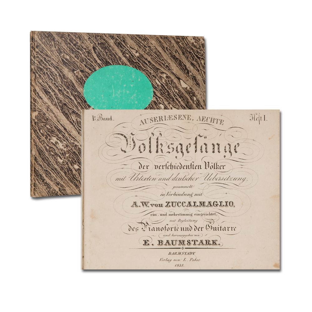 BAUMSTARK, E. [Hrsg.]: Auserlesene, Aechte Volksgesänge der verschiedenen Völker mit Urtexten und deutsche Uebersetzung gesammelt in Verbindung mit A.W. von Zuccalmaglio, ein-und mehrstimmig eingerichtet, mit Begleitung des Pianoforte und der Guitarre. 3 Hefte in 1 Band. Darmstadt, L. Pabst (ohne PlattenNr.) 1835-36. Quer-Oktav. 47 S., 3 Titelblätter. Pappband der Zeit.