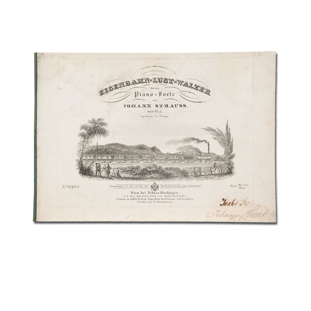 Sehr seltene Erstausgabe. - Die schöne Vignette zeigt die erste Dampfbahn-Fahrt der Kaiser-Ferdinands-Bahn nach Wagram (bei Wien) und wurde von Weigl/Dvorzack gestaltet. Die erste Fahrt der Eisenbahn fand in Wirklichkeit erst am 14. 11. 1837 statt. Im Hintergrund ist u.a. der Dom St. Stephan zu erkennen. - Mit dem auf S. 3 gedruckten Verlagsvertrag zwischen Strauss und Haslinger, durch den alle Kompositionen von Strauss in den alleinigen Besitz dieses Verlages übergehen sollten. - Weinmann S. 18; Schönherr S. 137; Strauss Werke II, 295.