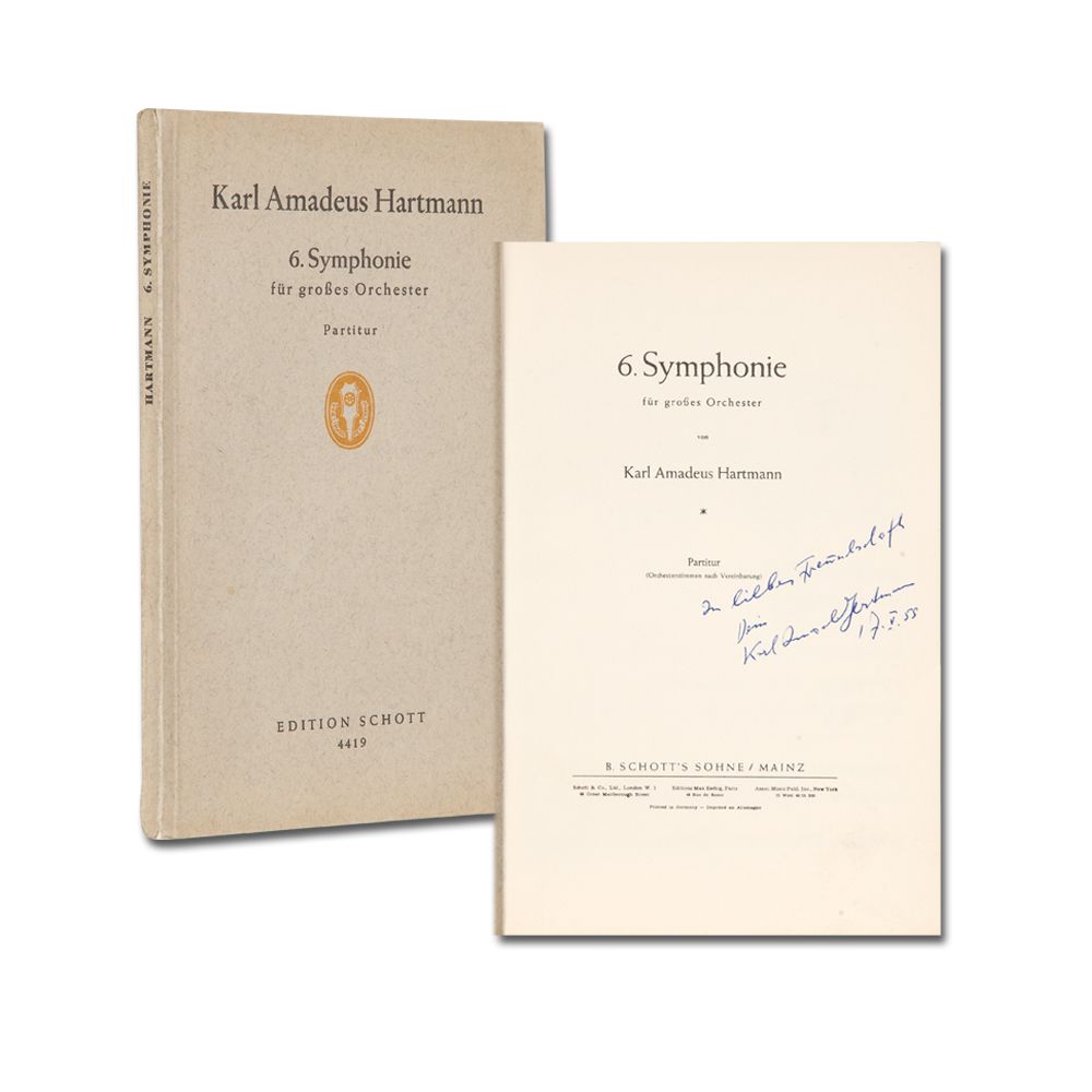 Titelblatt mit eigenh. Widmung und Unterschrift des Komponisten: In lieber Freundschaft Dein Karl Amadeus Hartmann. 17.V.55. - Wie bei den meisten anderen seiner Werke beruht auch Hartmanns 6. Sinfonie auf älteren Arbeiten. Die nunmehr endgültige Fassung entstand im Auftrag des bayerischen Rundfunks, die UA fand am 24. April 1953 in München mit dem Symphonie-Orchester des Bayerischen Rundfunks unter Eugen Jochum statt. - McCredie S. 197.