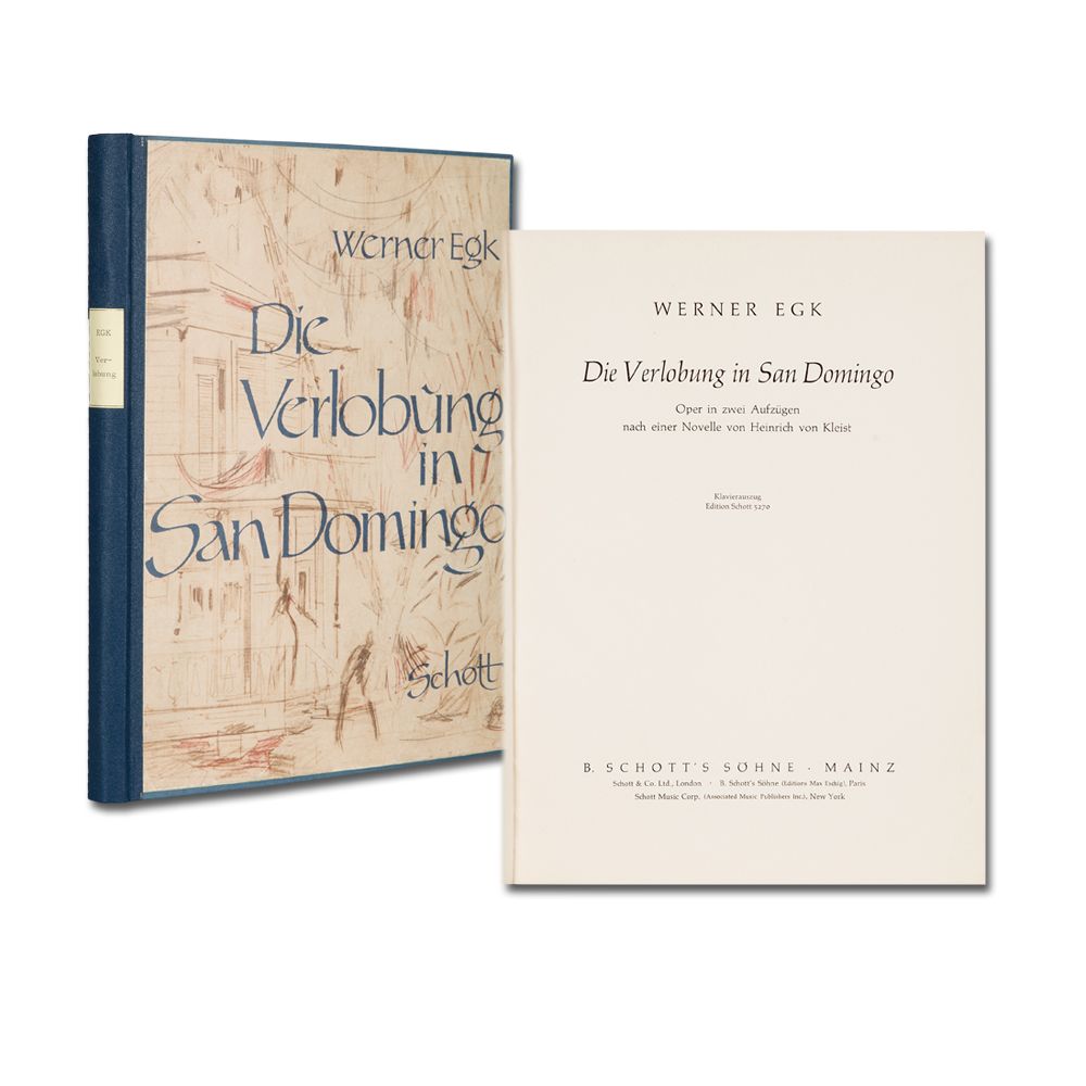 EGK, W.: Die Verlobung in San Domingo. Oper in zwei Aufzügen nach einer Novele von Heinrich von Kleist. Klavierauszug. Mainz Schott (VerlagsNr. 40 829) 1963 Quart. 4 Bl., 208 S. Halbleinenband unter Verwendung des Originalumschlages.