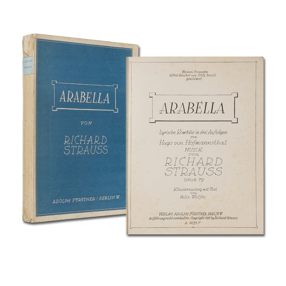 STRAUSS, R.: Arabella. Lyrische Komödie in 3 Aufzügen von Hugo von Hofmannsthal. Opus 79. Klavierauszug mit Text von Felix Wolfes. Berlin, Fürstner (VerlagsNr. A. 8253 F.) 1933. Folio. 365 S., anfangs etwas stockfleckig, sonst innen sehr schön. OKt. Stockfleckig.