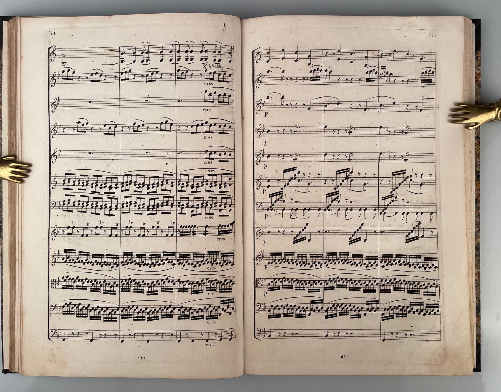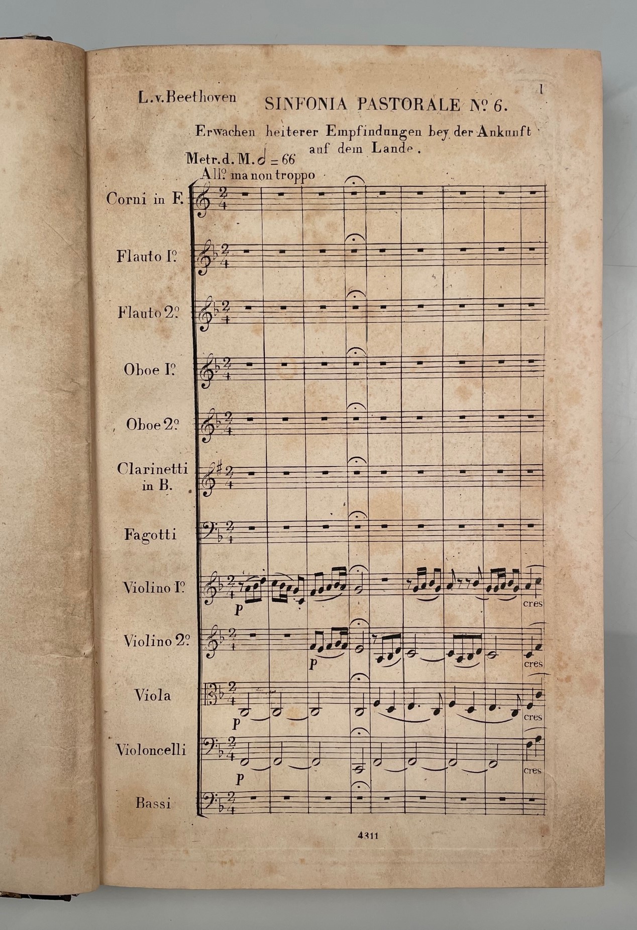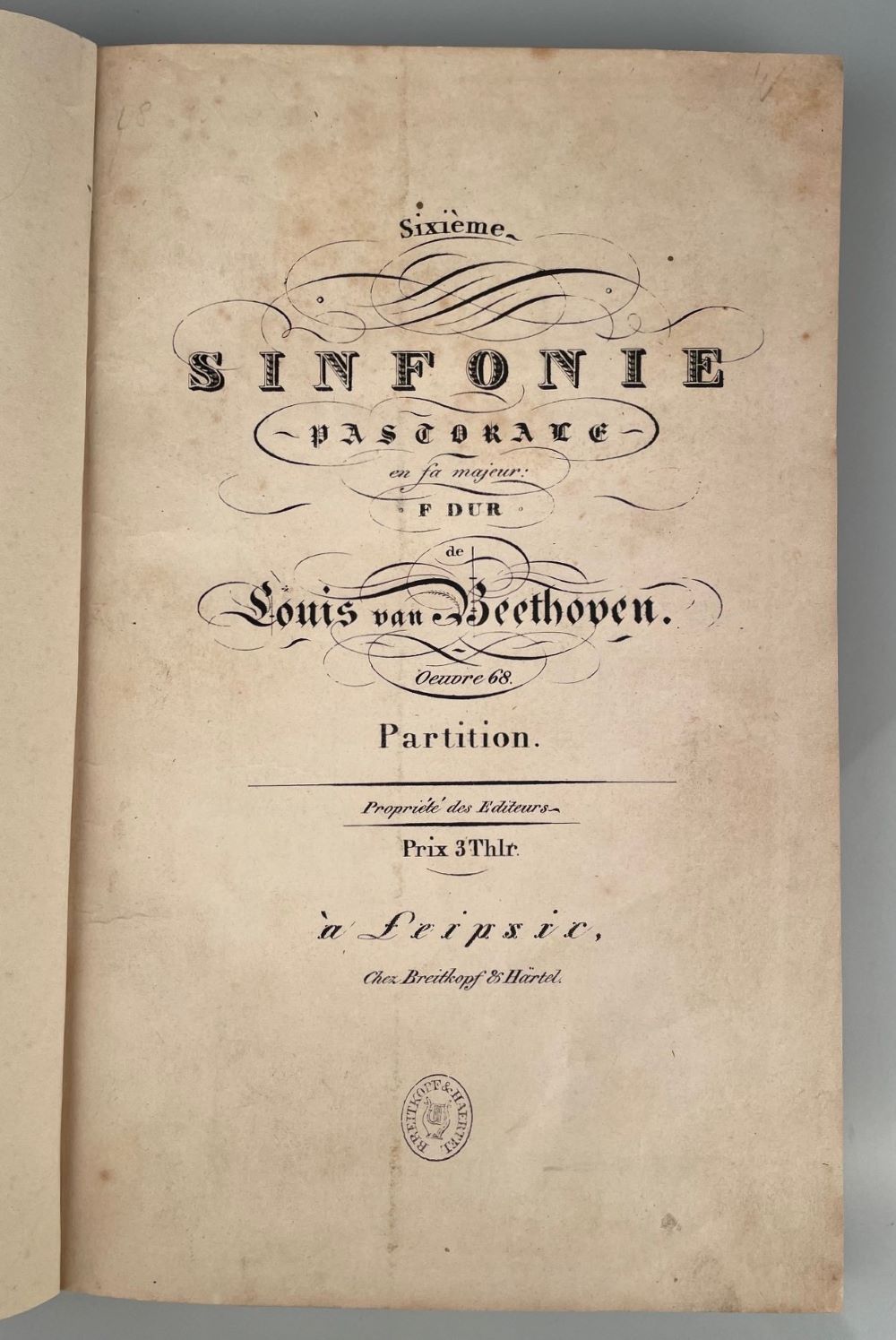 BEETHOVEN, L. v.: Sixième Sinfonie Pastorale en fa majeur: F Dur. Oeuvre 68. Partition. Leipsic Breitkopf & Härtel (PlateN°. 4311) [1826] Quarto. Title page lithographed, 188 pp. Small publisher's stamp - Kleiner Verlegerstempel. Partly somewhat foxed - Teils etwas stockfleckig. Half cloth binding with contemporary coloured paper - Halbleinenband mit zeitgenössischem Buntpapier.
