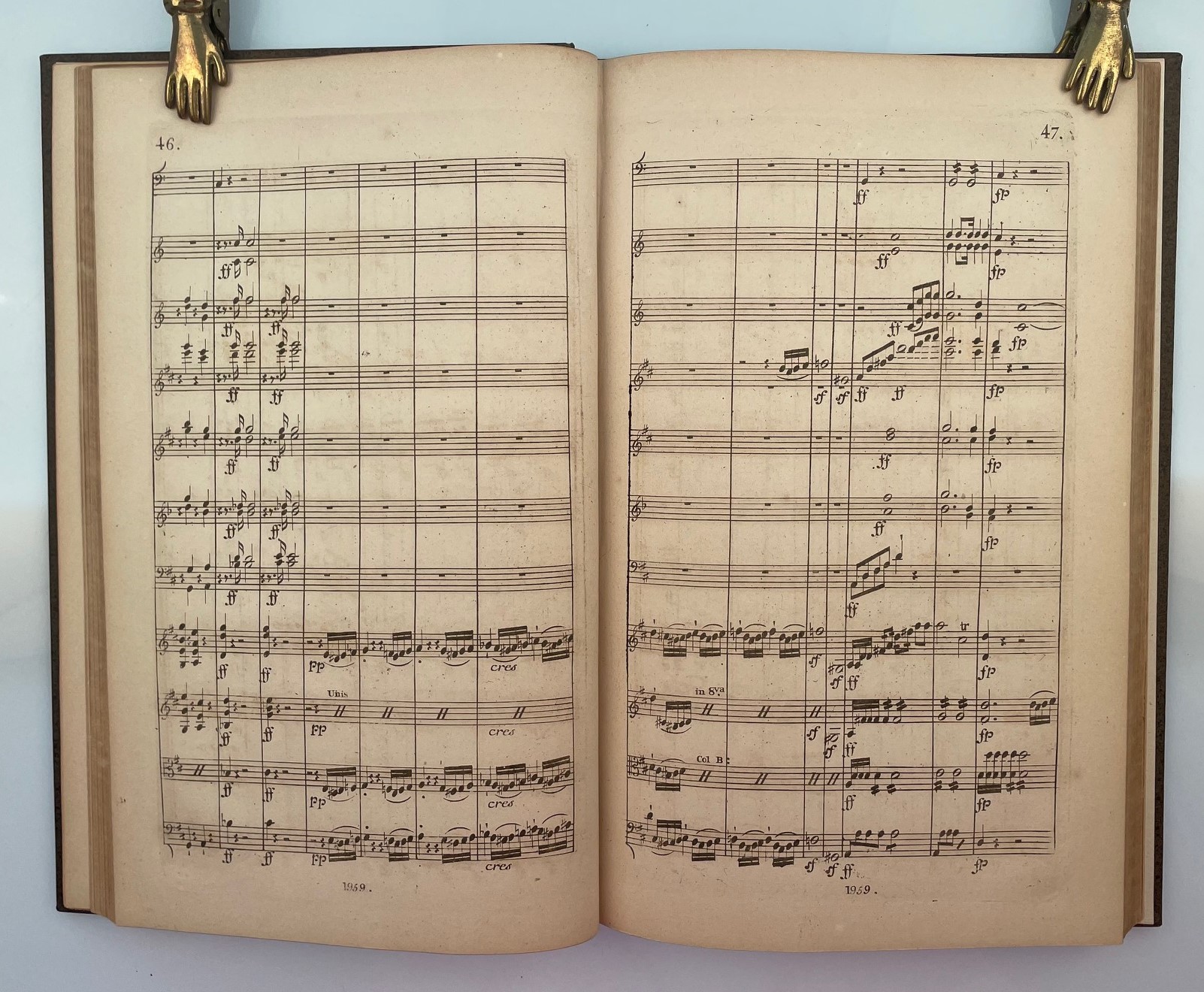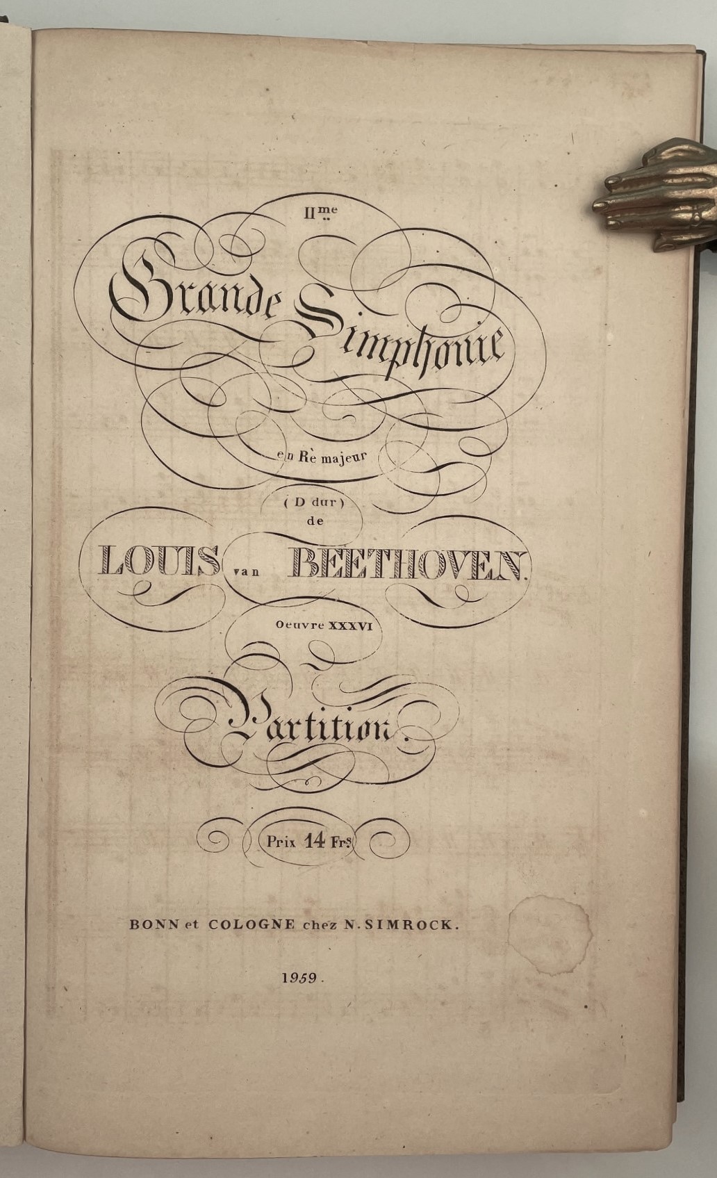 BEETHOVEN, L. v.: IIme. Grande Simphonie en Ré majeur (D dur). Oeuvre XXXVI. Partition. [2. Symphonie]. Bonn et Cologne, N. Simrock (PlattenNr. 1959) [1822] Quart. Titelblatt, 162 S. Wenige Blatt papierbedingt leicht stockfleckig, wenige Blatt mit Braunfleck. Titel mit kl. Wasserfleck, sonst sehr schönes Exemplar. Pappband im Stil der Zeit