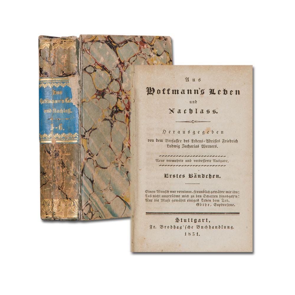 [HITZIG, J. E.]: Aus Hoffmann's Leben und Nachlass. Herausgegeben von dem Verfasser des Lebens-Abrisses Fr. L. Z. Werners. Neue vermehrte und verbesserte Ausgabe 6 Bände in 1 Stuttgart F. Brodhag 1831 Kleinoktav. Zusammen über 720 S., 4 Bl. Verlagsanzeigen. Pappband der Zeit.