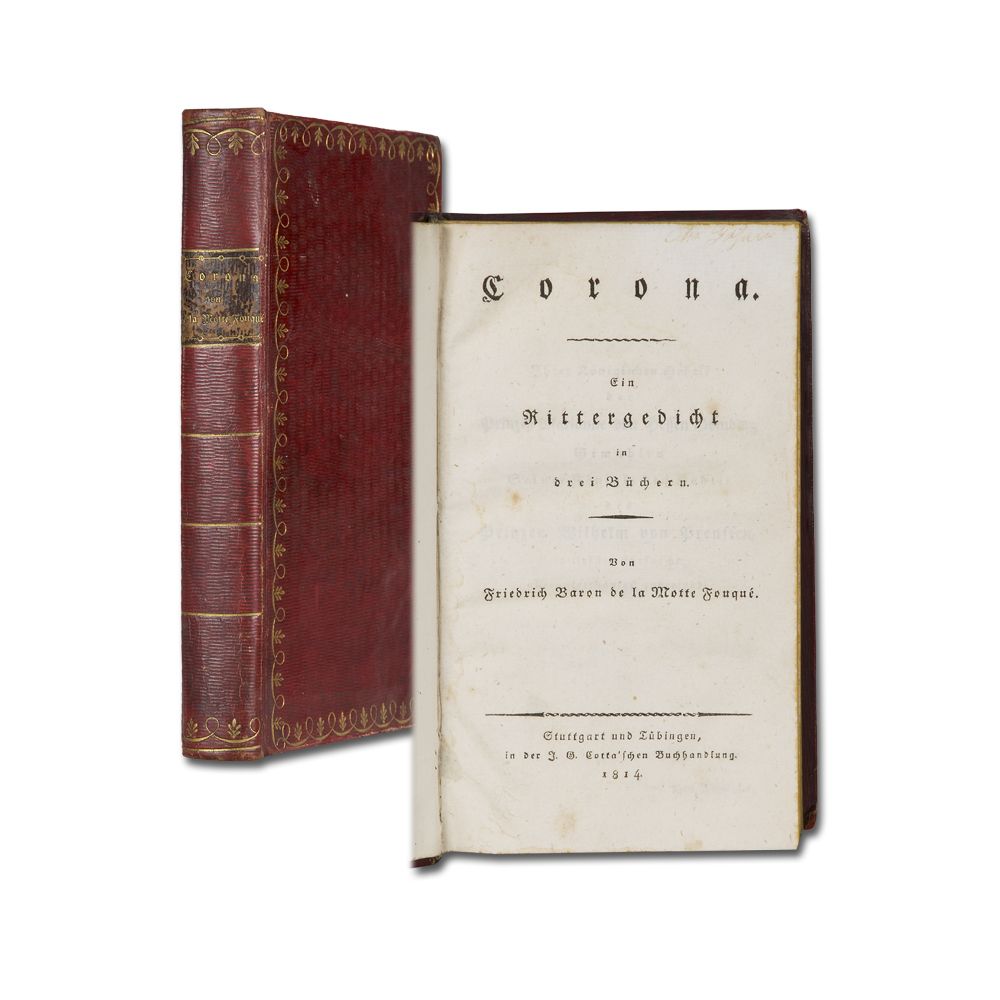 FOUQUÉ, Fr. de la Motte: Corona. Ein Rittergedicht in drei Büchern. Stuttgart und Tübingen J. G. Cotta 1814. XIV, 386 S., winziger Wurmgang, sonst schönes, frisches Exemplar. Lederband der Zeit mit Goldgirlanden auf den Deckeln, Ecken leicht bestoßen.