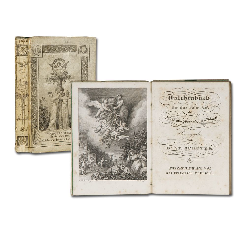 TASCHENBUCH für das Jahr 1826. Der Liebe und Freundschaft gewidmet. Hrsg. von St. Schütze. Frankfurt F. Wilmans [1825] Duodez. 2 Bl., 16, 309 S., 1 Bl., 14 Kupfertafeln gestochen u. a. von W. Jury. Vereinzelt etwas stockfleckig. Goldschnitt. Illustrierte Original-Kartonage.
